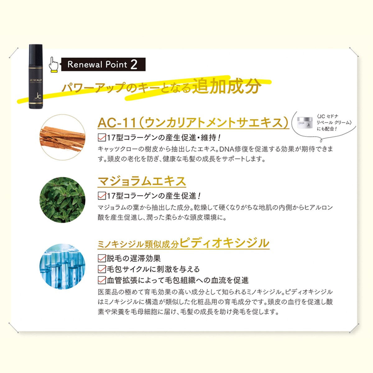 育毛サポート成分(7種)、ピディオキシジル、AC-11/マジョラムエキス、グリチルリチン酸ジカリウム